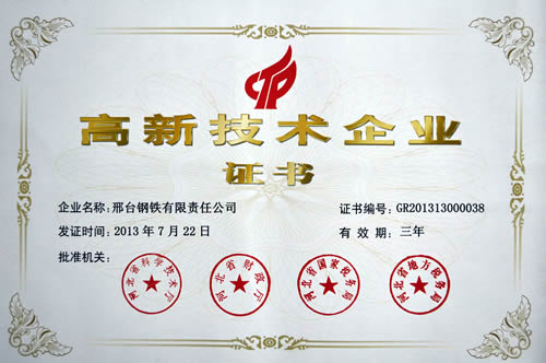 Xingtai Steel was named as one of the first batch of "High-tech Enterprise" of Hebei Province.