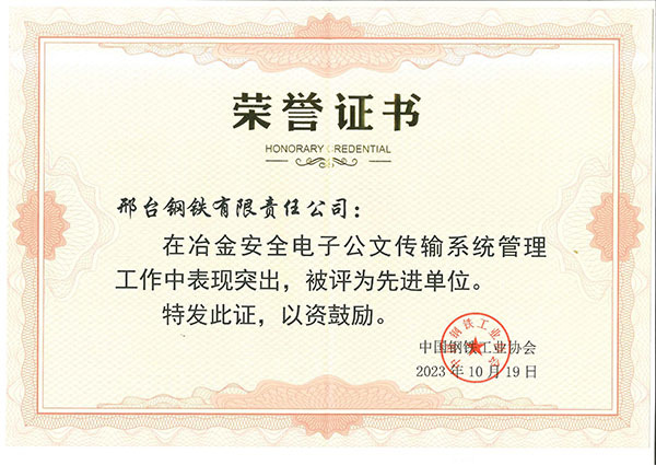 Xing Steel demonstrated outstanding performance in the management of metallurgical safety electronic document transmission systems and was recognized by the China Iron and Steel Industry Association as an advanced unit.