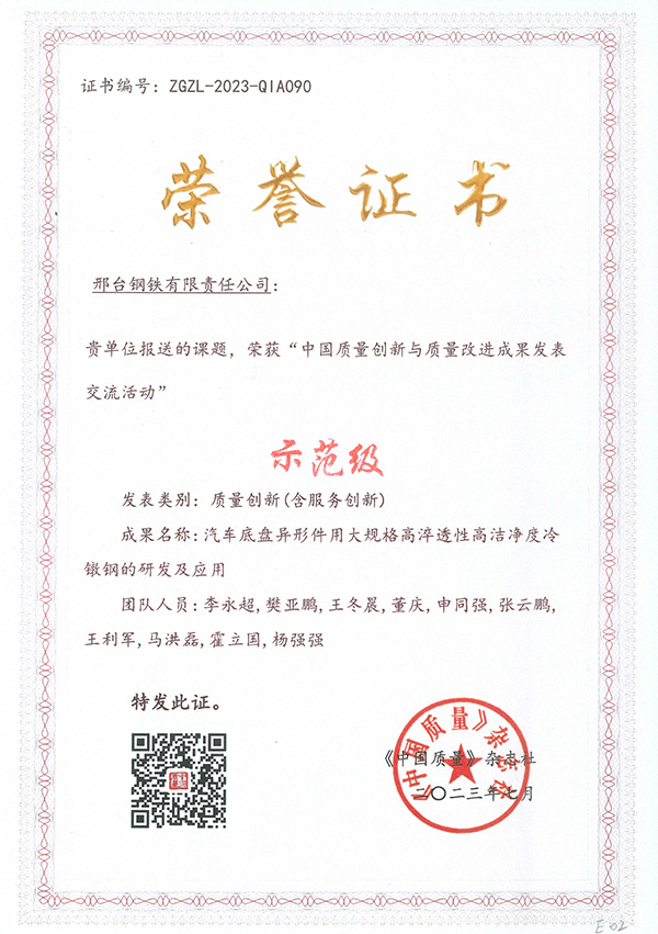 Xingtai Steel's achievement—"Development and Application of Large-Size High-Hardenability, Ultra-High-Cleanliness Cold Heading Steel for Automotive Chassis Special-Shaped Components"—was awarded the highest-level "Exemplary" honor at the 2023 China Quality Innovation & Quality Improvement Achievements Exchange Event.