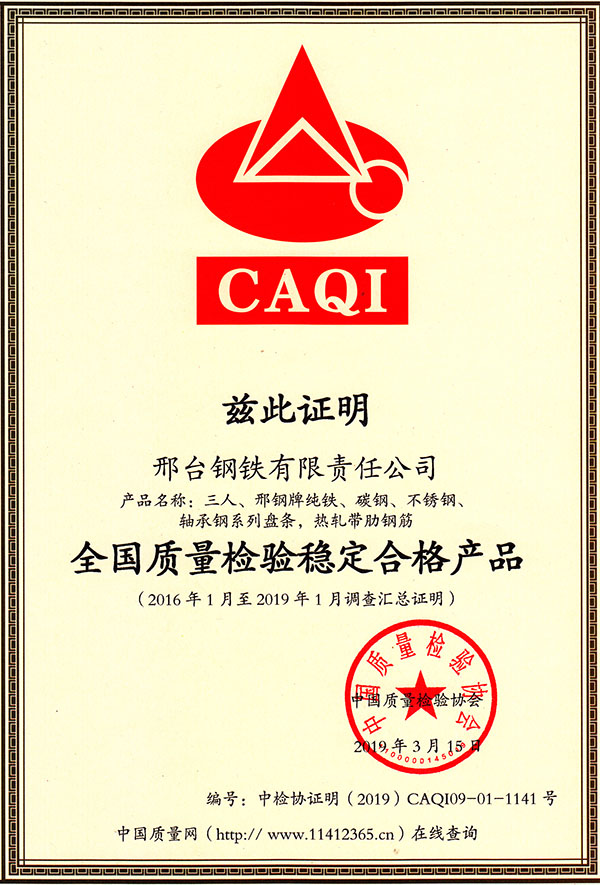 三人、邢鋼牌純鐵、碳鋼、不銹鋼、軸承鋼系列盤條,熱軋帶肋鋼筋產(chǎn)品,被評為全國質(zhì)量檢驗穩(wěn)定合格產(chǎn)品。