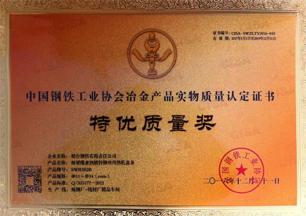 橋梁纜索熱鍍鋅鋼絲用熱軋盤條SWRS82BΦ11~Φ14(mm)獲得冶金產(chǎn)品實物質(zhì)量“特優(yōu)質(zhì)量獎”