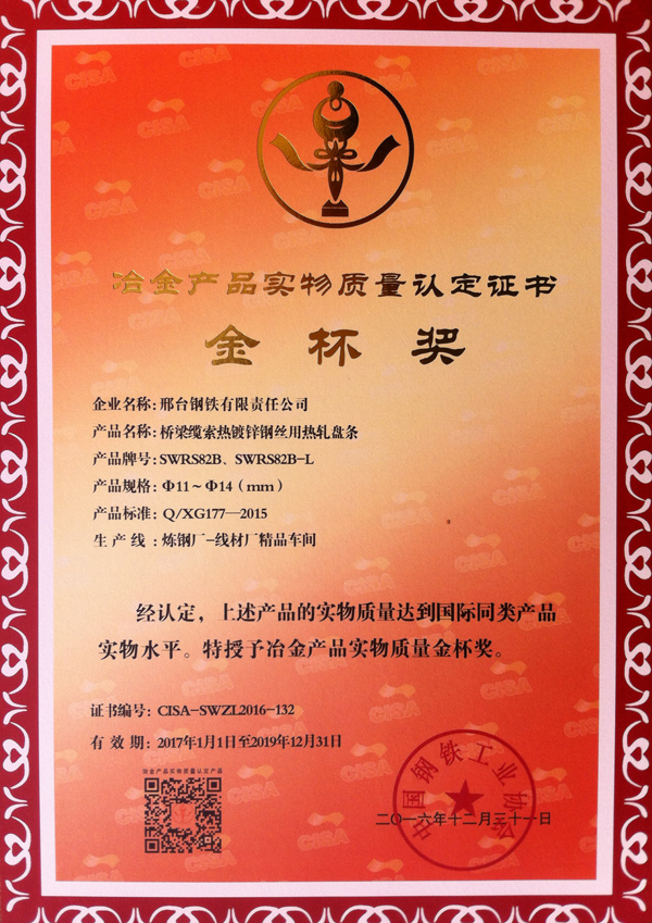 橋梁纜索熱鍍鋅鋼絲用熱軋盤條SWRS82B、SWRS82B-L Φ11~Φ14(mm)獲得冶金產(chǎn)品實物質(zhì)量“金杯獎”