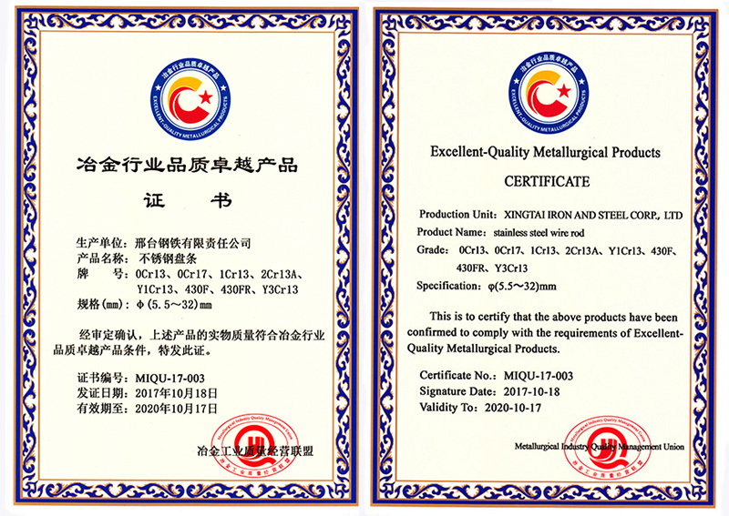 不銹鋼盤條0Cr13、0Cr17、1Cr13、2Cr13A、Y1Cr13、430F、430FR、Y3Cr13共8個牌號φ5.5- 32mm規(guī)格獲冶金行業(yè)品質(zhì)卓越產(chǎn)品