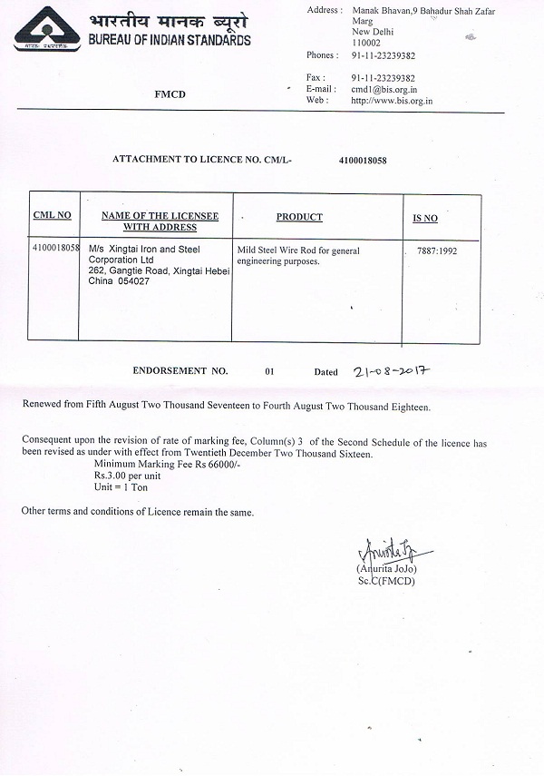 邢鋼申請印度BIS認(rèn)證的6個產(chǎn)品牌號(對應(yīng)邢鋼49個產(chǎn)品牌號)通過印度國家認(rèn)證