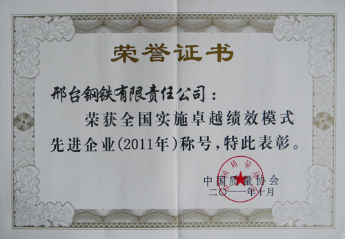 2011年10月,邢鋼榮獲“全國實(shí)施卓越績效模式先進(jìn)企業(yè)(2011年)稱號(hào)”。