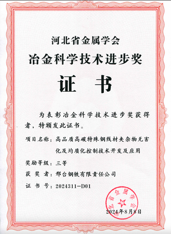 2024年8月8日,《高品質(zhì)高碳特殊鋼線材夾雜物無(wú)害化及均質(zhì)化控制技術(shù)開發(fā)及應(yīng)用》項(xiàng)目榮獲河北省冶金科學(xué)技術(shù)進(jìn)步獎(jiǎng)三等獎(jiǎng)。