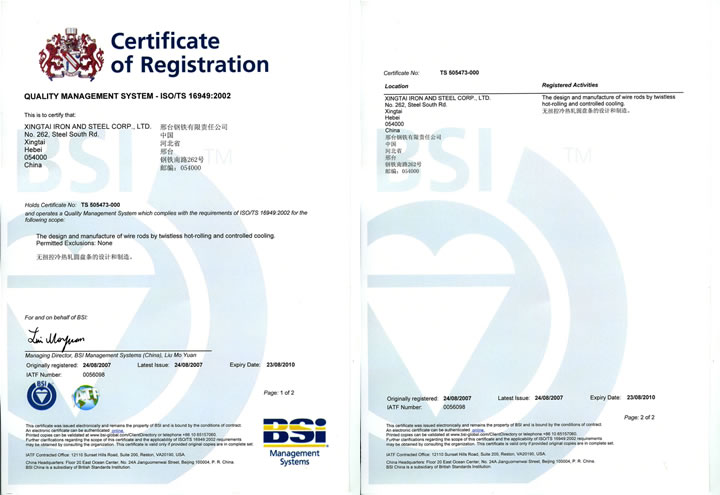 - 邢鋼獲ISO/TS 16949:2002認證證書(國際汽車行業(yè)質(zhì)量管理體系認證)