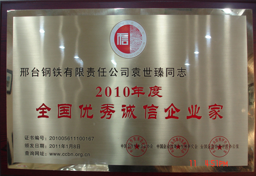 - 日前,在由中國(guó)合作貿(mào)易企業(yè)協(xié)會(huì)、中國(guó)企業(yè)改革與發(fā)展研究會(huì)、全國(guó)企業(yè)信用評(píng)價(jià)辦公室組織召開(kāi)的中國(guó)企業(yè)科學(xué)發(fā)展論壇暨誠(chéng)信表彰大會(huì)上,邢鋼被評(píng)為2010年度“中國(guó)AAA級(jí)信用企業(yè)”、公司榮獲“全國(guó)文明誠(chéng)信示范單位” 稱號(hào)、董事長(zhǎng)、總經(jīng)理袁世臻榮獲“全國(guó)優(yōu)秀誠(chéng)信企業(yè)家” 稱號(hào)。