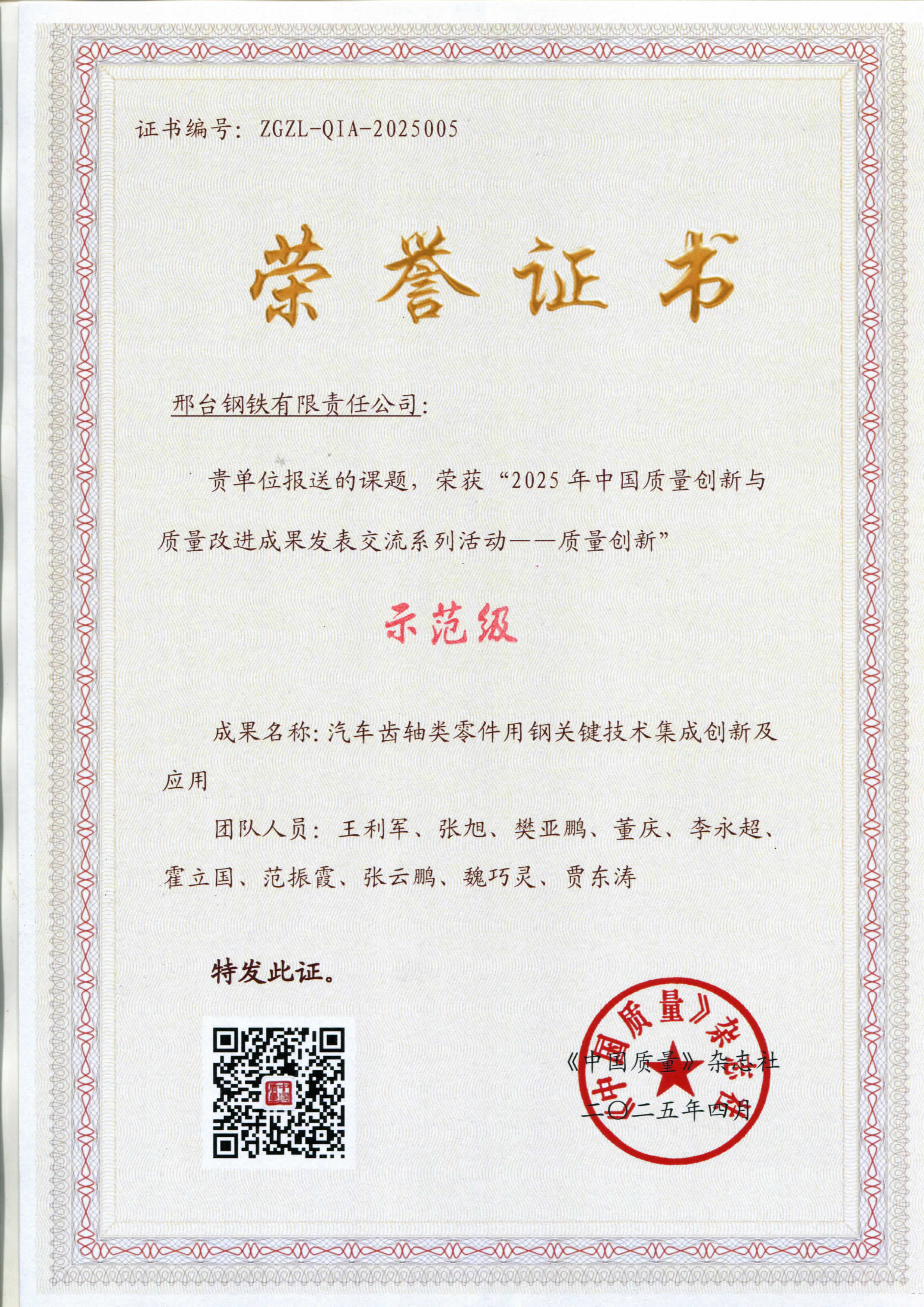 邢鋼團(tuán)隊榮獲2025年中國質(zhì)量創(chuàng)新成果“示范級”殊榮
