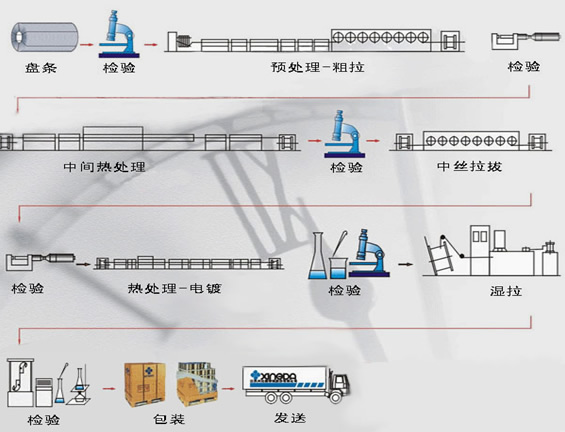 Ф5.5mm 盤條→預(yù)處理→粗拉→中絲熱處理(奧氏體化→索氏體化)→表面處理→中拉→成品前熱處理(奧氏體化→索氏體化)→表面處理→電鍍→熱擴散→濕拉→檢驗→包裝入庫。