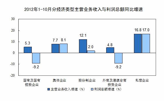 1-10月份,在規(guī)模以上工業(yè)企業(yè)中,國有及國有控股企業(yè)實現(xiàn)利潤11270億元,同比下降9.2%;集體企業(yè)實現(xiàn)利潤630億元,同比增長8.1%;股份制企業(yè)實現(xiàn)利潤23526億元,同比增長2%;外商及港澳臺商投資企業(yè)實現(xiàn)利潤9195億元,同比下降9.2%;私營企業(yè)實現(xiàn)利潤12623億元,同比增長17%。