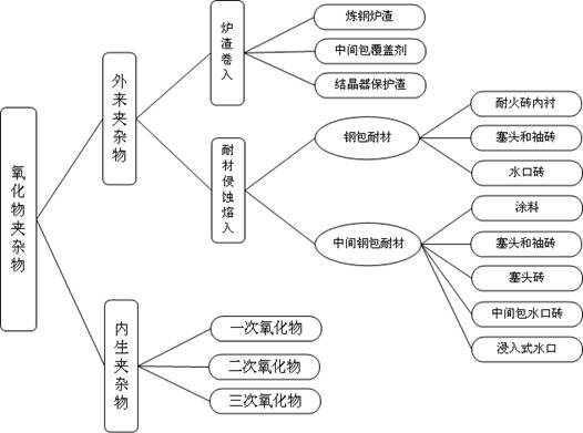 而外來(lái)夾雜主要是在鋼的熔煉、出鋼和澆鑄過(guò)程中,鋼液同耐火材料和爐渣相接觸,爐渣被卷入鋼液中(特別是出鋼的時(shí)候),耐火材料在高溫收到?jīng)_蝕,它的顆?;烊脘撘褐?,這些情況都難以避免?;烊脘撘褐械哪突鸩牧虾蜖t渣顆粒通過(guò)與鋼液起化學(xué)反應(yīng)不斷在成分和結(jié)構(gòu)上發(fā)生變化。這些顆粒,不論是剛剛被機(jī)械地帶入鋼液中的,還是經(jīng)歷了相當(dāng)變化的,一旦被滯留到鑄件中,就變成了鋼中的夾雜物,這些就叫外來(lái)夾雜物。外來(lái)一般來(lái)說(shuō)尺寸較大,外形不規(guī)則,結(jié)構(gòu)復(fù)雜,只是偶然在這里或者那里出現(xiàn)。夾雜物的來(lái)源和分類(lèi)下圖。