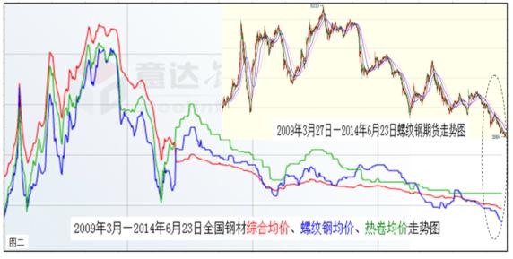 底線的提高,勢必助推中國經(jīng)濟大勢呈現(xiàn)前低后高的走勢。而經(jīng)過長期低迷的中國鋼材市場,也已經(jīng)具備逐漸走強的兩大要素:一是鋼市走強的外在環(huán)境趨好(見上圖一)。包括上半年推出一系列微刺激效應(yīng)逐漸顯現(xiàn),下半年由于經(jīng)濟增長底線提高,以及持續(xù)加推的動力措施等合成發(fā)酵,定會形成遠比上半年良好的鋼市發(fā)展環(huán)境;二是鋼市走強的內(nèi)在動能充沛(下圖二)。鋼材價格經(jīng)過長期下跌后,已經(jīng)下穿了所有的技術(shù)阻力位,使業(yè)內(nèi)根本無法從技術(shù)面進行詮釋。但從價值規(guī)律、市場規(guī)律以及基本面情況看,目前鋼材價格的底部特征已經(jīng)十分明顯,空方量能也已近衰竭。因此,經(jīng)過短時間的整固蓄勢后,震蕩上揚應(yīng)該是后期運行的主基調(diào)。如果再結(jié)合宏觀上經(jīng)濟增長底線的提高,下半年鋼材價格恢復(fù)性上揚既在情理之中,也是勢所必然。所以,基于經(jīng)濟和鋼市大勢筆者作出,下半年全國鋼材價格勢必高于上半年的預(yù)測。