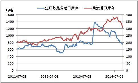 圖二:焦炭、焦煤港口庫(kù)存走勢(shì)