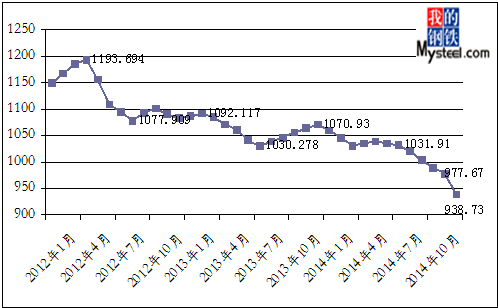 2014年12月份,上海鋼聯(lián)大宗商品價格指數(shù)(MyBCIC)初值為938.73,同比下跌了12.34%;環(huán)比下跌了3.98%,同環(huán)比跌幅繼上月均有所擴大。