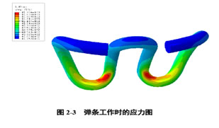 彈條是高速鐵路扣件系統(tǒng)中的核心部件。我國高速鐵路采用的是ω形彈條。彈條的作用是將鋼軌牢牢地固定在鐵墊板上,除必須有一定扣壓力外,還必須能承受來自鋼軌的垂向力、橫向力和縱向力的作用。在工作過程中,彈條不僅有彎曲變形,還有扭曲變形,本身呈現(xiàn)比較復(fù)雜的應(yīng)力狀態(tài)。下圖是在初始扣壓力下用有限元軟件分析的彈條應(yīng)力圖。從圖中可以看出:兩臂與中間兩肢連接處是變形集中的部位,急劇的彎曲變形引起彈條疲勞壽命降低。應(yīng)力最大處在彈條外側(cè)兩臂與中間兩肢連接之處,這也是彈條實際失效之處。