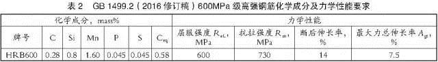 目前國內(nèi)有沙鋼、承鋼和濟(jì)鋼等鋼廠具備成功生產(chǎn)600MPa級(jí)熱軋螺紋鋼筋的經(jīng)驗(yàn)。表2為GB l499.2(2016修訂稿)對(duì)600MPa級(jí)高強(qiáng)鋼筋HRB600化學(xué)成分和力學(xué)性能的要求。
