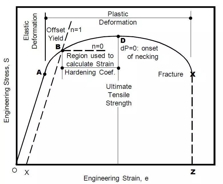 拉伸試驗(yàn)是最采用的力學(xué)性能測(cè)試試驗(yàn),通過(guò)拉伸曲線(xiàn)我們可以獲得一系列的材料力學(xué)性能參數(shù)。那么從拉伸曲線(xiàn)上我們參提取出來(lái)哪些有用的信息呢?