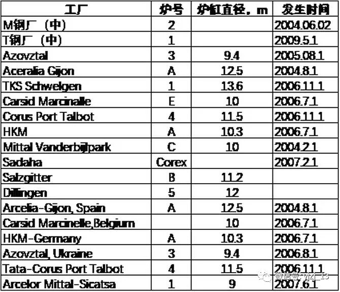 以下針對(duì)國(guó)內(nèi)外典型高爐爐缸燒出案例進(jìn)行統(tǒng)計(jì),并對(duì)燒出原因、修復(fù)和維護(hù)等方面進(jìn)行詳細(xì)的說明,為國(guó)內(nèi)外高爐的長(zhǎng)壽提供技術(shù)和數(shù)據(jù)參考。