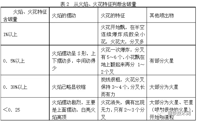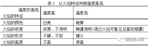 由上二表可見不能只憑一種“視覺信號(hào)”就判斷出爐內(nèi)的情況,而是根據(jù)多種信號(hào)綜合判斷爐內(nèi)情況,例如要從火焰的顏色、濃度、形狀、高度等來(lái)綜合判斷爐內(nèi)溫度情況。在判斷終點(diǎn)含碳量時(shí),既要看火花特征,還可考慮火焰形狀的變化。在收高碳時(shí)要看火焰擺動(dòng)的幅度,由大至小,在收低碳時(shí)要看火焰下降情況。