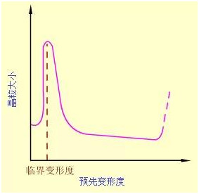 (2)預(yù)先變形度 變形度的影響主要與金屬變形的均勻度有關(guān)。變形越不均勻, 再結(jié)晶退火后的晶粒越大。變形度很小時,因不足以引起再結(jié)晶,晶粒不變。當變形度達到2~10%時,金屬中少數(shù)晶粒變形,變形分布很不均勻,所以再結(jié)晶時生成的晶核少,晶粒大小相差極大,非常有利于晶粒發(fā)生吞并過程而很快長大,結(jié)果得到極粗大的晶粒。使晶粒發(fā)生異常長大的變形度稱作臨界變形度。生產(chǎn)上應(yīng)盡量避免在臨界變形度范圍內(nèi)的塑性變形加工。超過臨界變形度之后,隨變形度的增大,晶粒的變形更加強烈和均勻,再結(jié)晶核心越來越多,因此再結(jié)晶后的晶粒越來越細小。但是當變形度過大(約≥90%)時, 晶??赡茉俅纬霈F(xiàn)異常長大,一般認為它是由形變織構(gòu)造成的。
