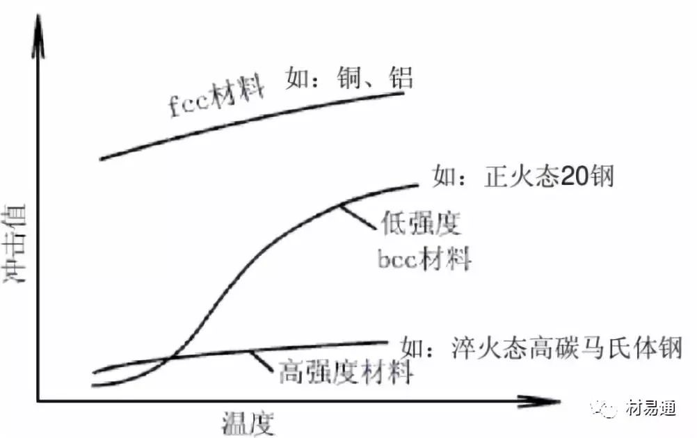 體心立方晶體金屬及合金或某些密排六方晶體金屬及其合金,特別是工程上常用的中、低強(qiáng)度結(jié)構(gòu)鋼(鐵素體-珠光體鋼),在試驗(yàn)溫度低于某一溫度tk時(shí),會(huì)由韌性狀態(tài)變?yōu)榇嘈誀顟B(tài),沖擊吸收功明顯下降,斷裂機(jī)理由微孔聚集型變?yōu)榇┚Ы饫?,斷口特征由纖維狀變?yōu)榻Y(jié)晶狀,這就是低溫脆性,又稱(chēng)為冷脆。這種轉(zhuǎn)變稱(chēng)為韌脆轉(zhuǎn)變。轉(zhuǎn)變溫度稱(chēng)為韌脆轉(zhuǎn)變溫度,又稱(chēng)為冷脆轉(zhuǎn)變溫度。