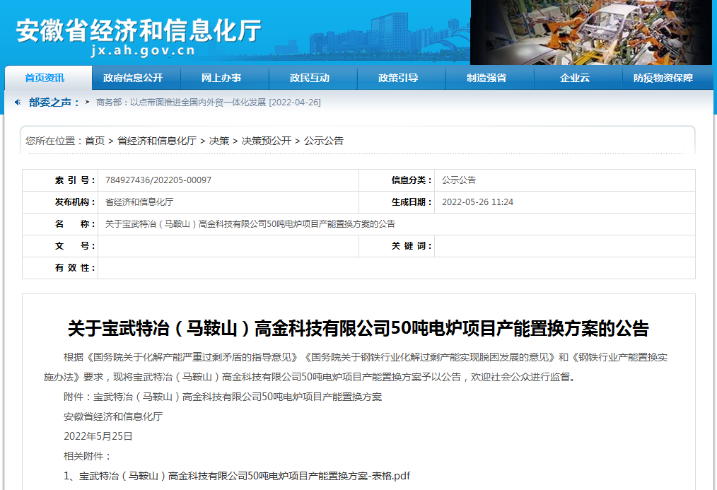 按照《國務(wù)院關(guān)于化解產(chǎn)能嚴(yán)重過剩矛盾的指導(dǎo)意見》、《國務(wù)院關(guān)于鋼鐵行業(yè)化解過剩產(chǎn)能實(shí)現(xiàn)脫困發(fā)展的意見》和《鋼鐵行業(yè)產(chǎn)能置換實(shí)施辦法》要求,經(jīng)國務(wù)院國資委復(fù)函同意,擬將武鋼有限轉(zhuǎn)爐產(chǎn)能以及寶鋼特鋼電爐產(chǎn)能出讓?,F(xiàn)將武鋼有限1座90噸轉(zhuǎn)爐102萬噸煉鋼產(chǎn)能、寶鋼特鋼1座60噸電爐14萬噸煉鋼產(chǎn)能出讓方案予以公示,公示期為2022年5月25日-6月22日,歡迎社會(huì)公眾進(jìn)行監(jiān)督。