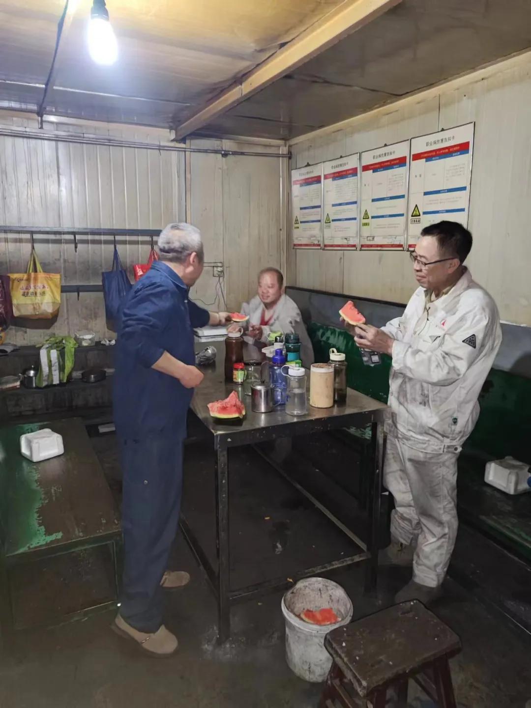 “天氣炎熱,大家辛苦了”,在爐前,侯副總親自把西瓜送到員工手里,并送上節(jié)日的祝福“端午安康!”希望大家在工作中注意做好防暑降溫,避免中暑,工作中合理分配體力,既要保證西場(chǎng)主溝澆筑過程安全,又要保證東場(chǎng)單場(chǎng)出鐵過程安全。在二燒混合機(jī)檢修現(xiàn)場(chǎng),侯總了解檢修進(jìn)度,叮囑維修、燒結(jié)車間主任,要注意檢修過程人員安全,保證檢修質(zhì)量,為二燒設(shè)備穩(wěn)定運(yùn)行奠定基礎(chǔ)。