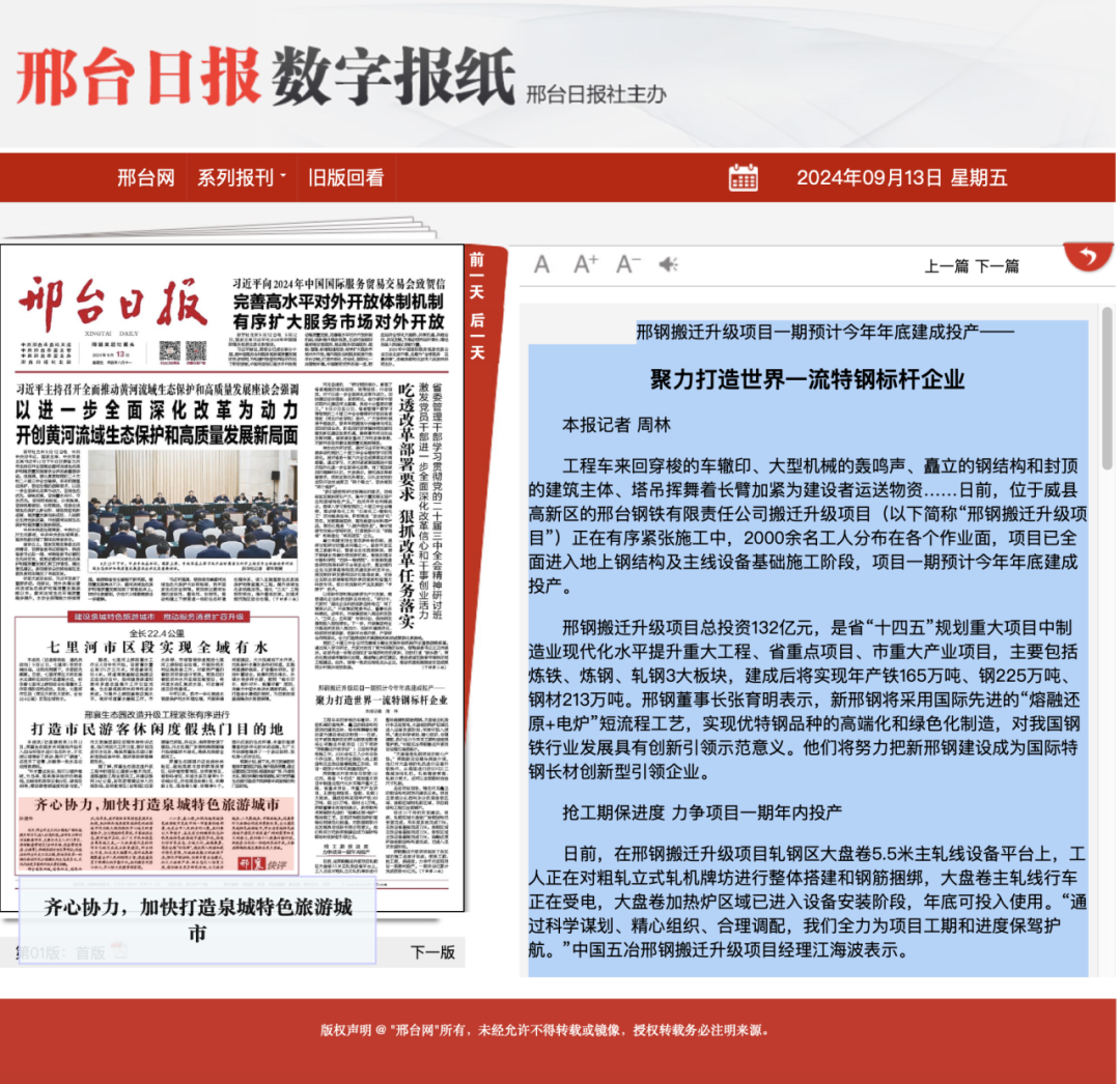 邢鋼搬遷升級項目總投資132億元,是省“十四五”規(guī)劃重大項目中制造業(yè)現(xiàn)代化水平提升重大工程、省重點項目、市重大產(chǎn)業(yè)項目,主要包括煉鐵、煉鋼、軋鋼3大板塊,建成后將實現(xiàn)年產(chǎn)鐵165萬噸、鋼225萬噸、鋼材213萬噸。邢鋼董事長張育明表示,新邢鋼將采用國際先進的“熔融還原+電爐”短流程工藝,實現(xiàn)優(yōu)特鋼品種的高端化和綠色化制造,對我國鋼鐵行業(yè)發(fā)展具有創(chuàng)新引領示范意義。他們將努力把新邢鋼建設成為國際特鋼長材創(chuàng)新型引領企業(yè)。