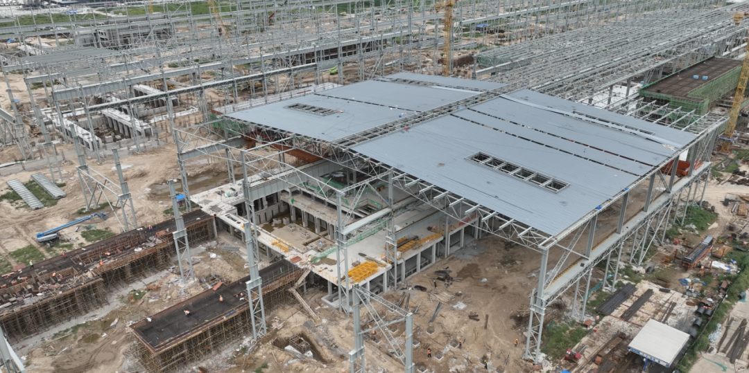 走在項目現(xiàn)場,隨處可見矗立的鋼結構和封頂?shù)慕ㄖ黧w。項目主要部分從西向東分別是煉鐵區(qū)域、煉鋼區(qū)域和軋鋼區(qū)域,項目鋼結構工程已全面鋪開。