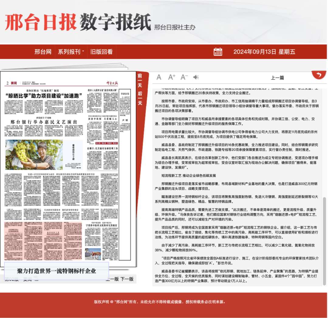 邢鋼搬遷升級項目是落實省市戰(zhàn)略部署,布局縣域新材料產(chǎn)業(yè)基地的重大決策,也是打造威縣300億元特鋼產(chǎn)業(yè)集群的龍頭項目、戰(zhàn)略支撐項目。 瞄準建設世界一流特鋼標桿企業(yè),該項目將聚焦高強度耐熱鋼、免退火冷鐓鋼、高強度耐延遲斷裂鋼等10大系列高精尖鋼種,塑造綠色、精品、智慧的特鋼品牌。