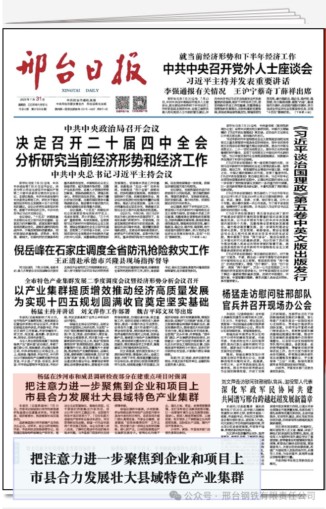 楊猛在調(diào)研中強(qiáng)調(diào),沙河玻璃、邢臺(tái)特鋼在我市傳統(tǒng)產(chǎn)業(yè)轉(zhuǎn)型升級(jí)中具有代表性和示范性,各級(jí)各相關(guān)部門(mén)要認(rèn)真落實(shí)省、市委全會(huì)精神,緊緊圍繞“投資消費(fèi)質(zhì)效年”工作主線,把注意力進(jìn)一步向企業(yè)和項(xiàng)目聚焦,潛心抓產(chǎn)業(yè),以有效投資推動(dòng)產(chǎn)業(yè)集群發(fā)展壯大。要常態(tài)化問(wèn)需于企,強(qiáng)化土地、資金、政策等要素保障,實(shí)打?qū)崕椭髽I(yè)解決困難問(wèn)題,以一流營(yíng)商環(huán)境為企業(yè)發(fā)展增動(dòng)能、強(qiáng)信心。要深入推進(jìn)邢商回邢、以商招商,吸引更多上下游配套企業(yè)來(lái)邢投資發(fā)展,加快延長(zhǎng)產(chǎn)業(yè)鏈,提升產(chǎn)品市場(chǎng)競(jìng)爭(zhēng)力。