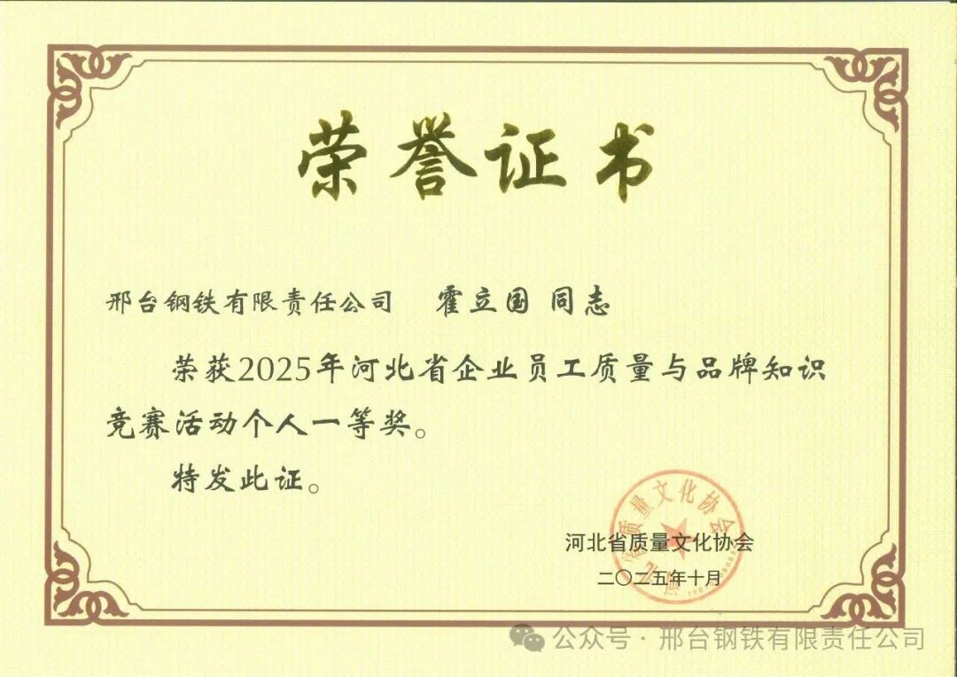 Recently, the results of the 2025 Hebei Provincial Enterprise Employees Quality and Brand Knowledge Contest were announced. Thanks to its excellent organization and outstanding performance of employees in answering questions, Xingtai Iron and Steel Co., Ltd. won the "Excellent Organization Award", and 6 of its employees claimed the first, second and third prizes respectively in the individual category.